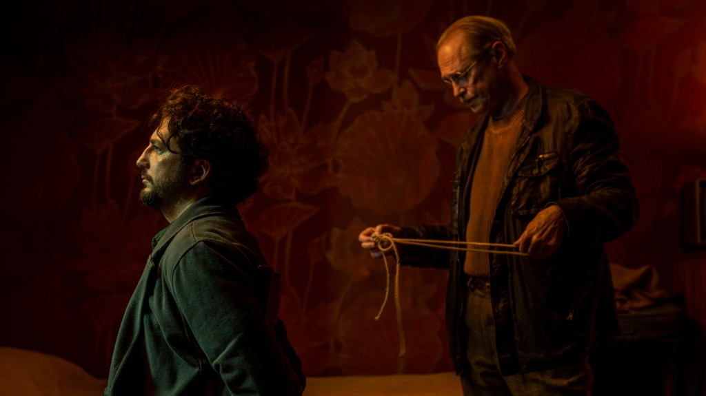And now for something completely different. The unfortunate title The Shallow Tale of a Writer Who Decided to Write About a Serial Killer portends a case of quirkiness overload. The opening scene, set in the year 40,000 B.C. in Slovenia, certainly confirms that suspicion. It’s the vision of a writer working on his second novel, about the romance between a Neanderthal and a Homo Sapiens. That writer, Keane (John Magaro), had a minor success with his first book, but he’s struggling and doesn’t realize that his marriage to Suzie (Britt Lower of TV’s “Severance”) is in big trouble; she sees him as a milquetoast and a bore. But Keane has a fan: Kollmick (Steve Buscemi), a chatty fellow he meets in a bar, who eventually confides that he’s a “retired serial killer” and would be the perfect subject for Keane’s next book.