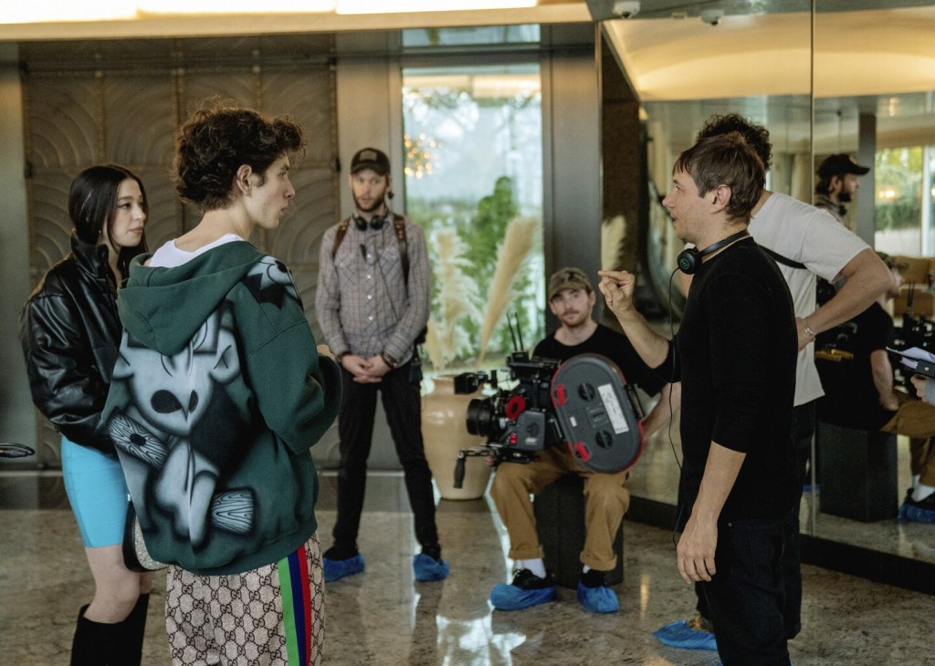 Sean Baker (right) directing Mikey Madison and Mark Eydelshteyn on the set of Anora. Photo courtesy Augusta Quirk/Neon.